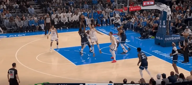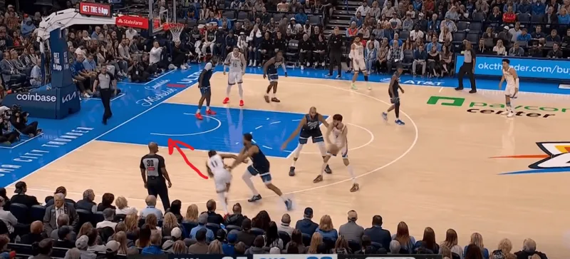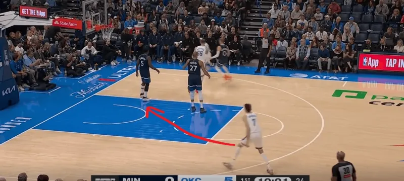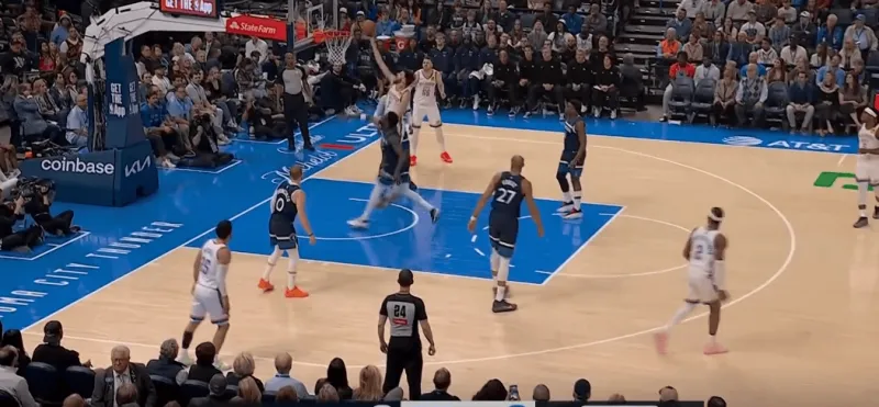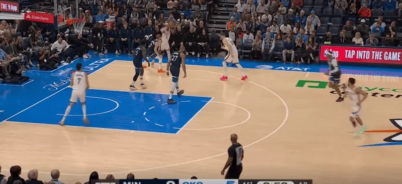 雷霆前场三对三,SGA面对底线附近的严防,身后切特迅速切入篮下,利用爱德华兹和戈贝尔的注意力接SGA高抛完成终结: