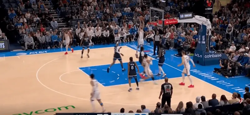防守端雷霆双人逼迫多森姆走底线,弱侧的切特先是封锁底角的接球,随后见多森姆传篮下戈贝尔,又迅速回收将球抢断,成功完成弱侧一防二。断球后迅速策动反击,接以赛亚乔高抛篮下杀伤: